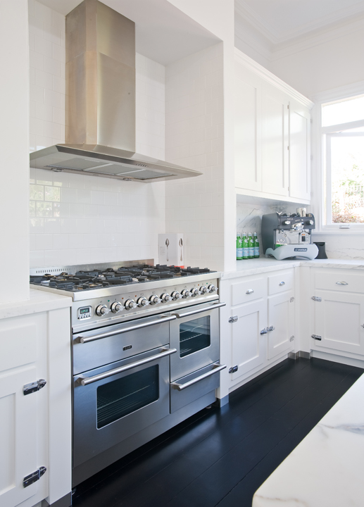 The cabinetry features American-style doors and a two-pack Dulux finish in ‘Vivid White’ that contrasts strikingly with the polished floorboards, which have a stunning ‘Black Japan’ stain. Calacatta marble was selected for the benchtops and splashbacks to add a timeless beauty to the space, while ample bench space and state-of-the-art appliances were incorporated into the design to further enhance the kitchen’s functionality.