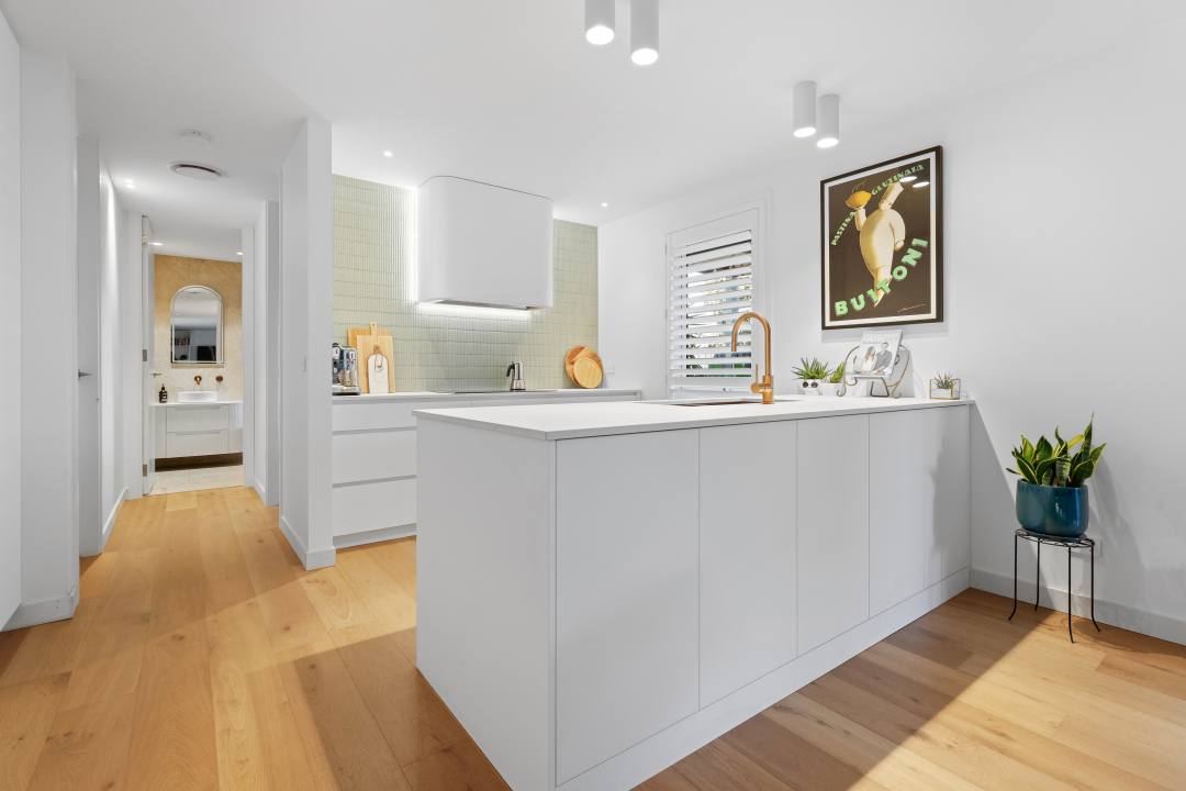 This recent kitchen project stands out from the crowd with eye-catching features and a unique and refined aesthetic. The client requested a modern brass-accented, all-white kitchen with ample storage and fully integrated appliances for a sleek and uncluttered look. The team delivered on this and more – with soothing, elegant features that add to the space without commanding it. From the beautifully curved rangehood to the stunning kit kat tile splashback, the design offers a subtle twist on a simple kitchen design.