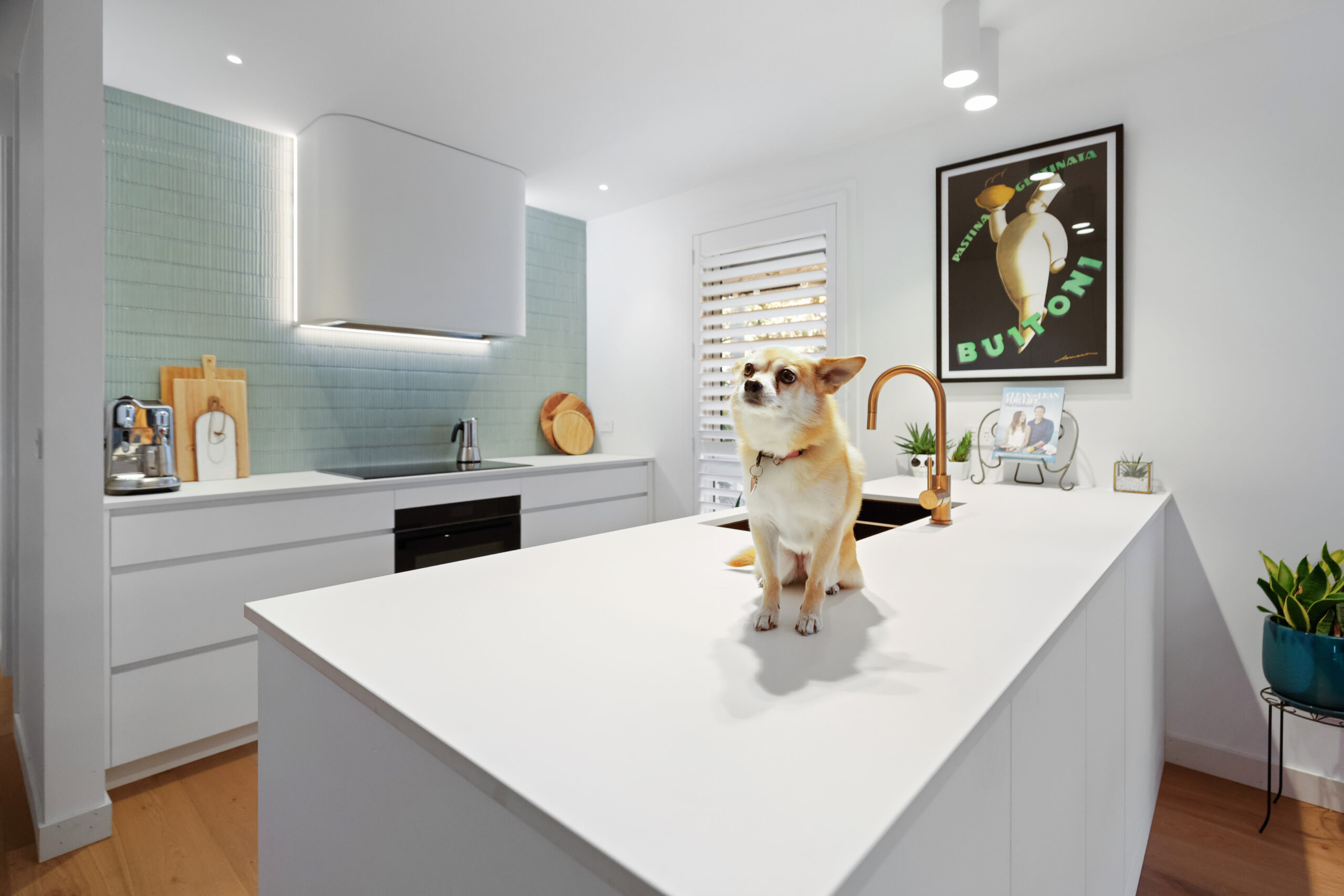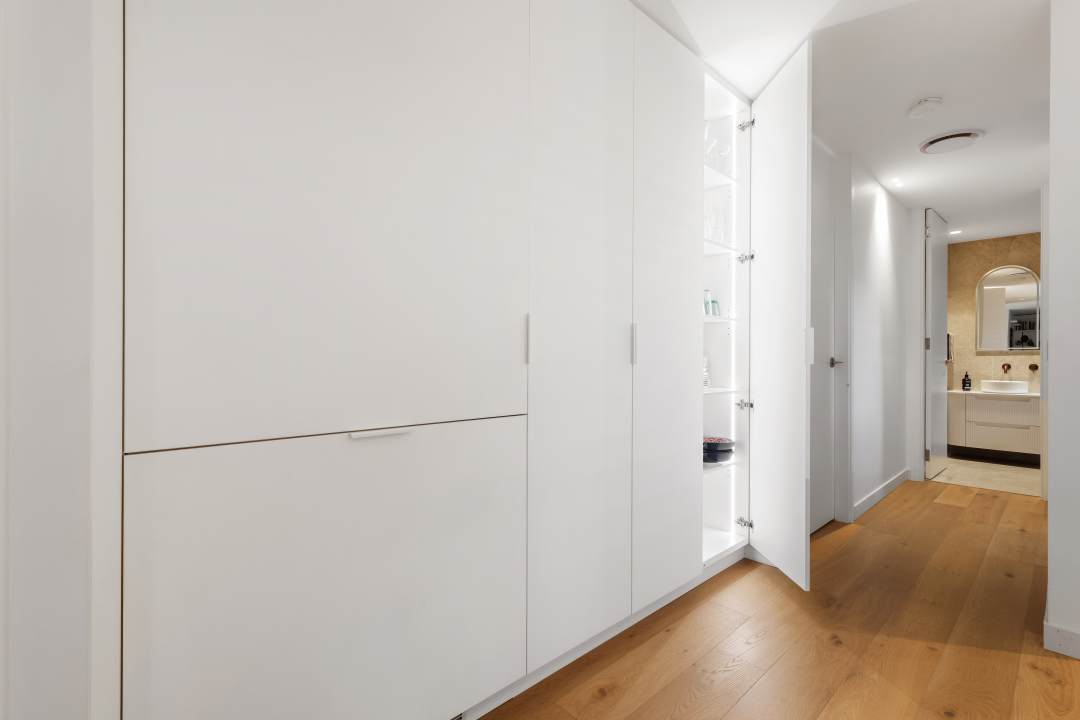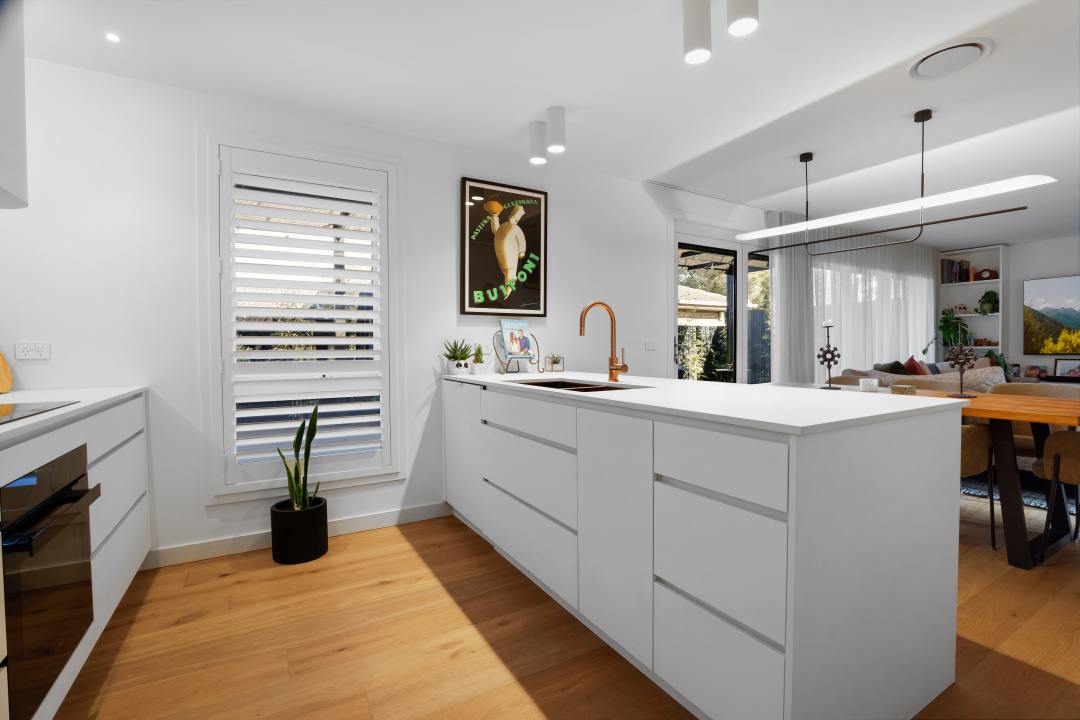 The masterful execution of the design began with quality materials. Polytec’s Venette White was used to create a striking matte white finish, while Caesarstone’s Pure White gives the benchtops a seamless, clean look. Integrated appliances were incorporated to preserve the minimalist style, while a combination of integrated and matte white lip pull handles enhanced the contemporary design. Storage needs were met with a full-size pantry and a custom appliance nook.