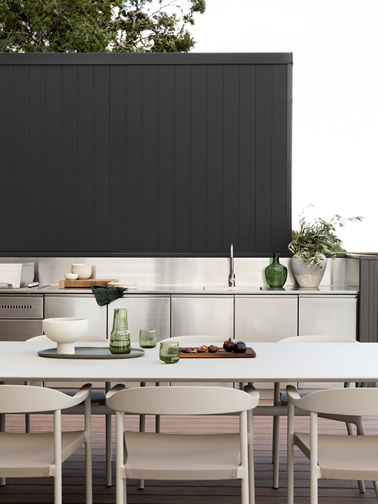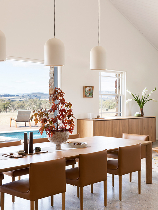 The palette for this renovation was inspired by the external environment and the changing colours of the landscape throughout the seasons. These colours not only achieve this look, but also act as a way to warm the expansive interiors. Outside, a gorgeous outdoor kitchen was installed with an integrated fridge and barbecue, the stainless steel beautifully standing out against the backdrop.