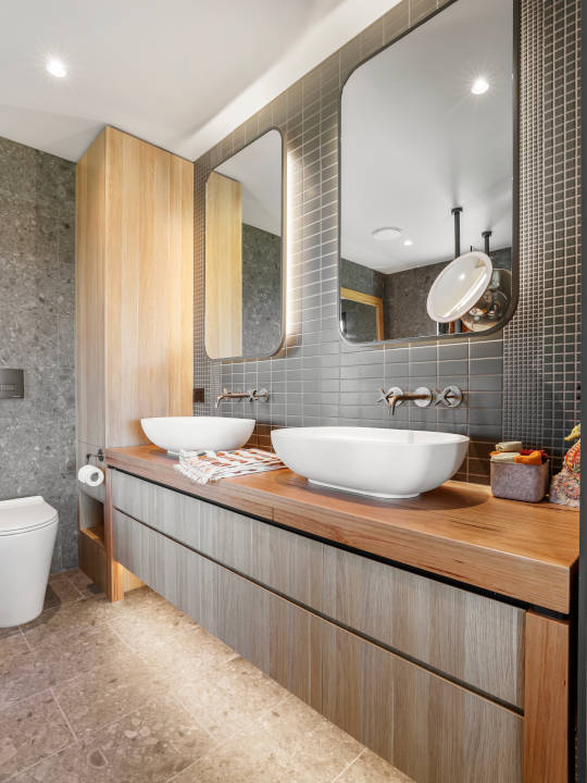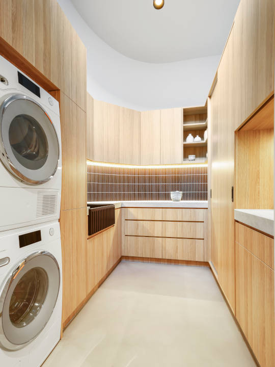 The kitchen features a carefully curated mix of high-quality materials and finishes that create a warm, inviting atmosphere. The cabinetry is finished in Polytec Sepia Oak – Ravine and Polytec Matera – Navona Stone, offering rich texture and depth. The bold Laminam Calce Nero stone benchtop makes a luxurious statement, balancing elegance with functionality. The design incorporates thoughtful storage solutions that make the most of the space, seamlessly combining practicality with aesthetic appeal. Contrasting textures and colours are layered to add visual interest and character, resulting in a kitchen that is both stylish and highly functional.