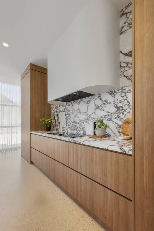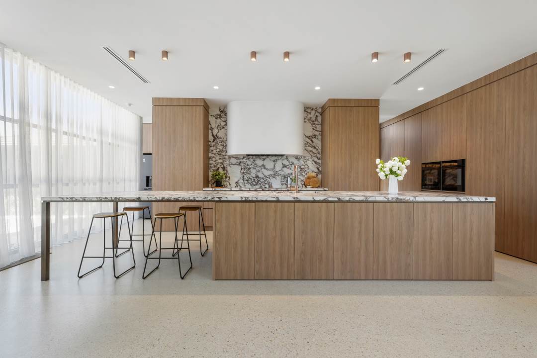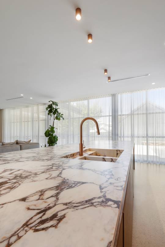 Every feature has its place, creating a layout that optimised both functionality and fluidity. High-end materials elevate the space, including Smartstone Calacatta Viola for a striking stone finish, Laminex Absolute Grain Refined Walnut for rich kitchen joinery and a custom table frame in medium-age bronze with a wax finish. The balance of the home’s old-world charm and a modern edge is achieved through open communication and thoughtful collaboration between the client and the design team, eventuating in a timelessly classic contemporary interior.