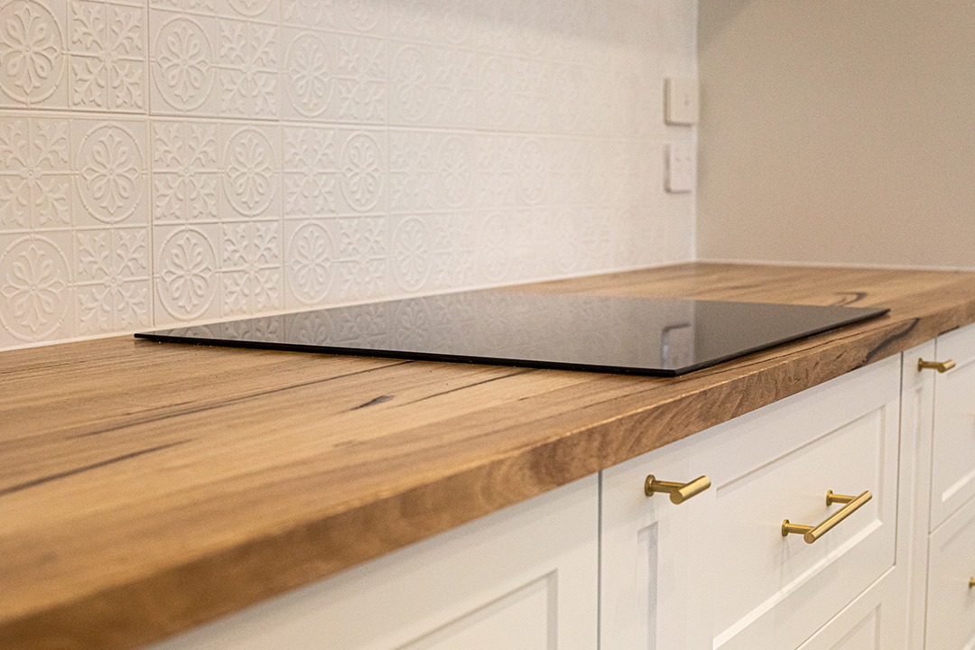 The homeowner’s heart was set on transforming their tired kitchen into a welcoming, fresh and homely room; the wormy chestnut timber benchtop effortlessly helps to create this feeling. Thanks to the large size of the allocated space, Country Lifestyle Benchtops was able to extend the main island top to 2.9 metres wide and 1.1 metres deep, including an overhang for extra seating. The water-based Cabot’s clear coat stain gives it a smooth, shining finish, complementing the hardwood floors found throughout the adjoining lounge room and the rest of the home.