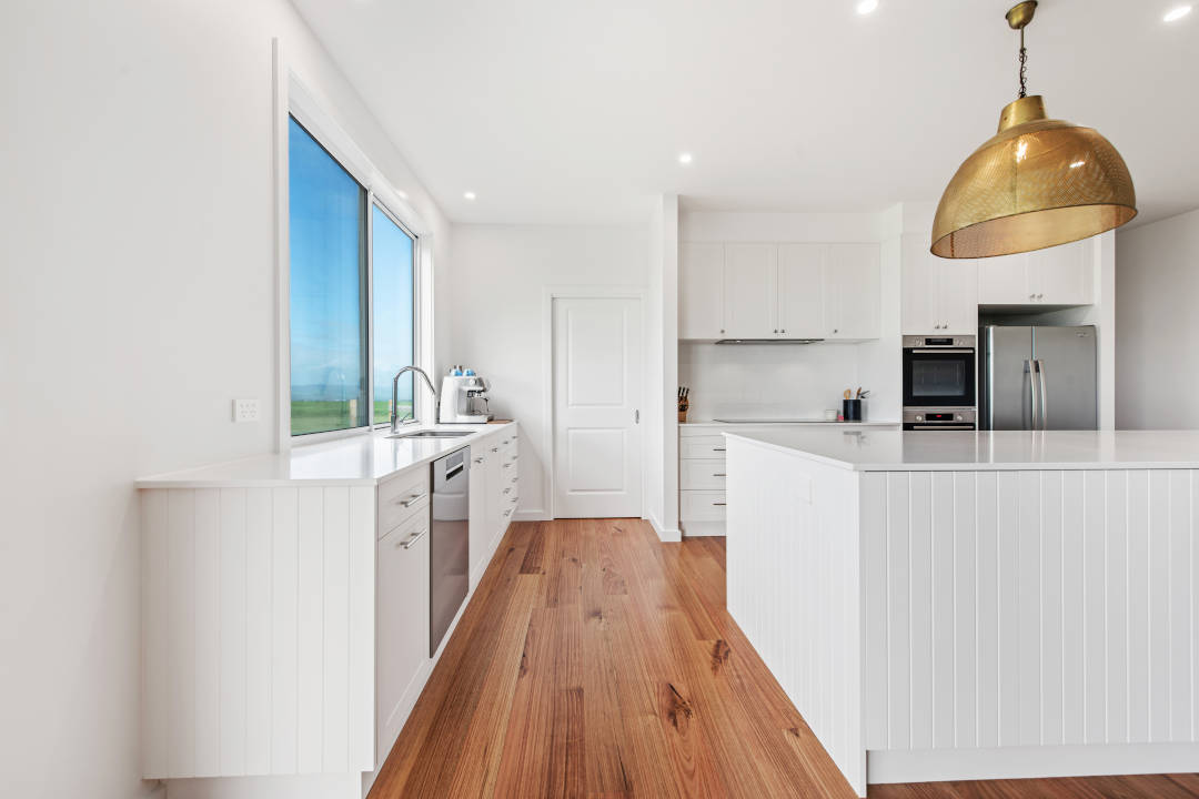 A standout feature of the design is the wrap-around pantry, which integrates seamlessly with the kitchen while making excellent use of the available hallway space for additional storage. The materials used include vinyl wrap doors and silica-free engineered stone countertops, both of which offer durability and aesthetic appeal. In line with Crosscut Kitchens’ commitment to sustainability, eco-friendly features include the use of sustainably harvested timber, with offcuts recycled as fuel for manufacturing processes. The left-over vinyl scraps were repurposed into plastic hoses and other household items, supporting a circular approach to production.