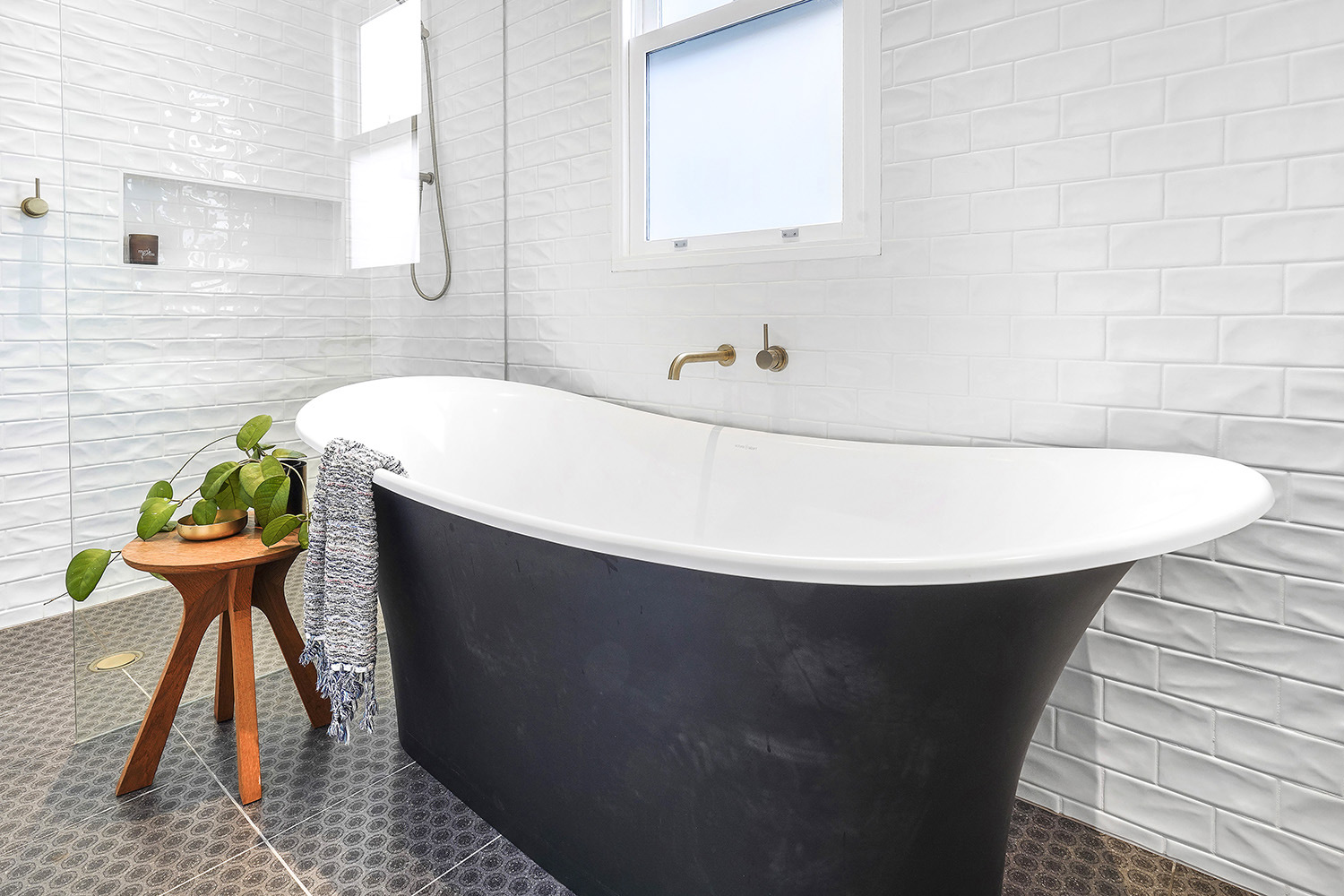 Much like the rest of the renovation, the bathroom pays homage to the home’s Victorian heritage. Incorporating a neutral colour palette, it maintains a link to the modern renovation whilst also referencing to the traditional with the patterned floor tiles, beautiful old bathtub and freestanding American Oak vanity.