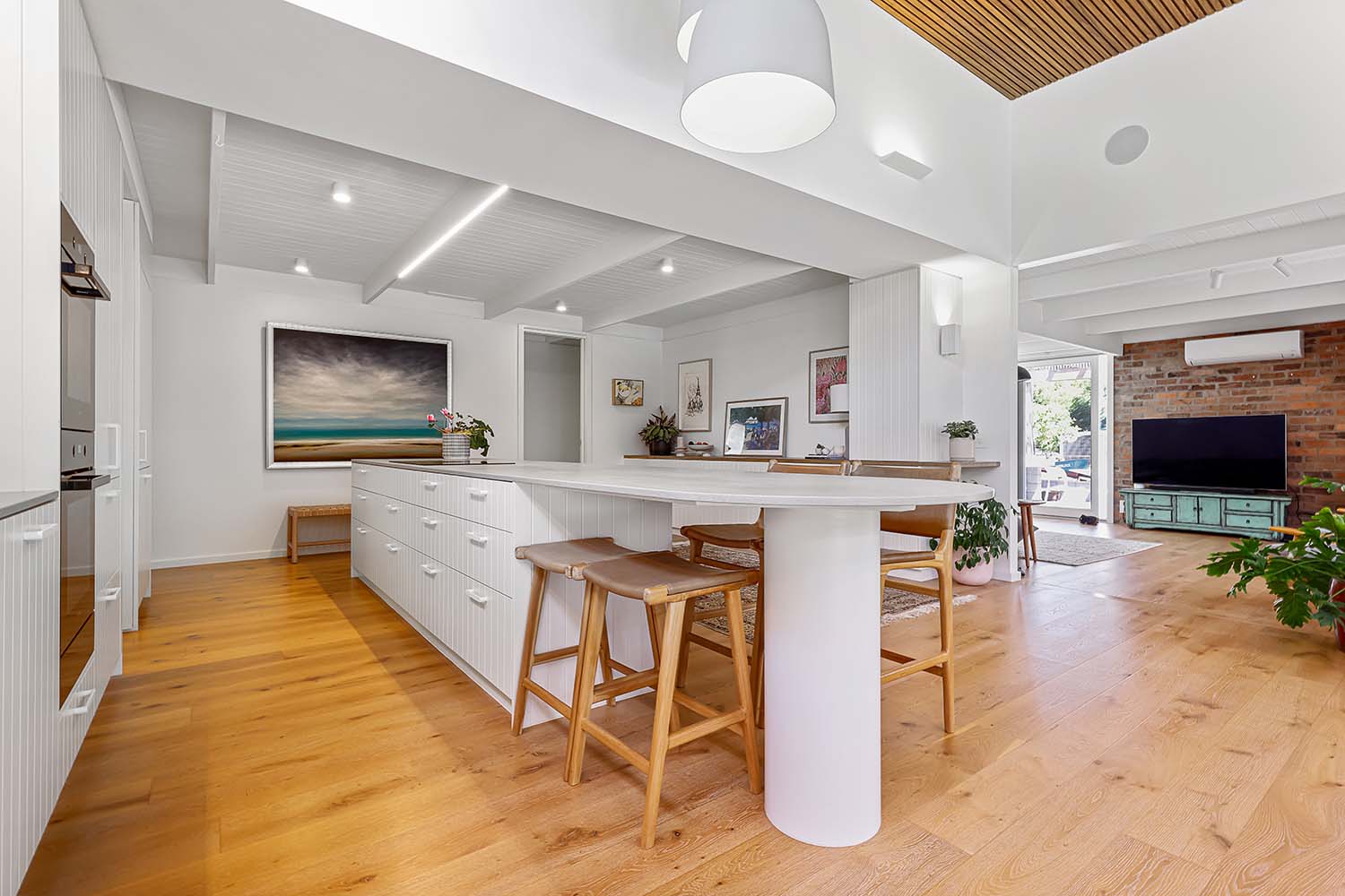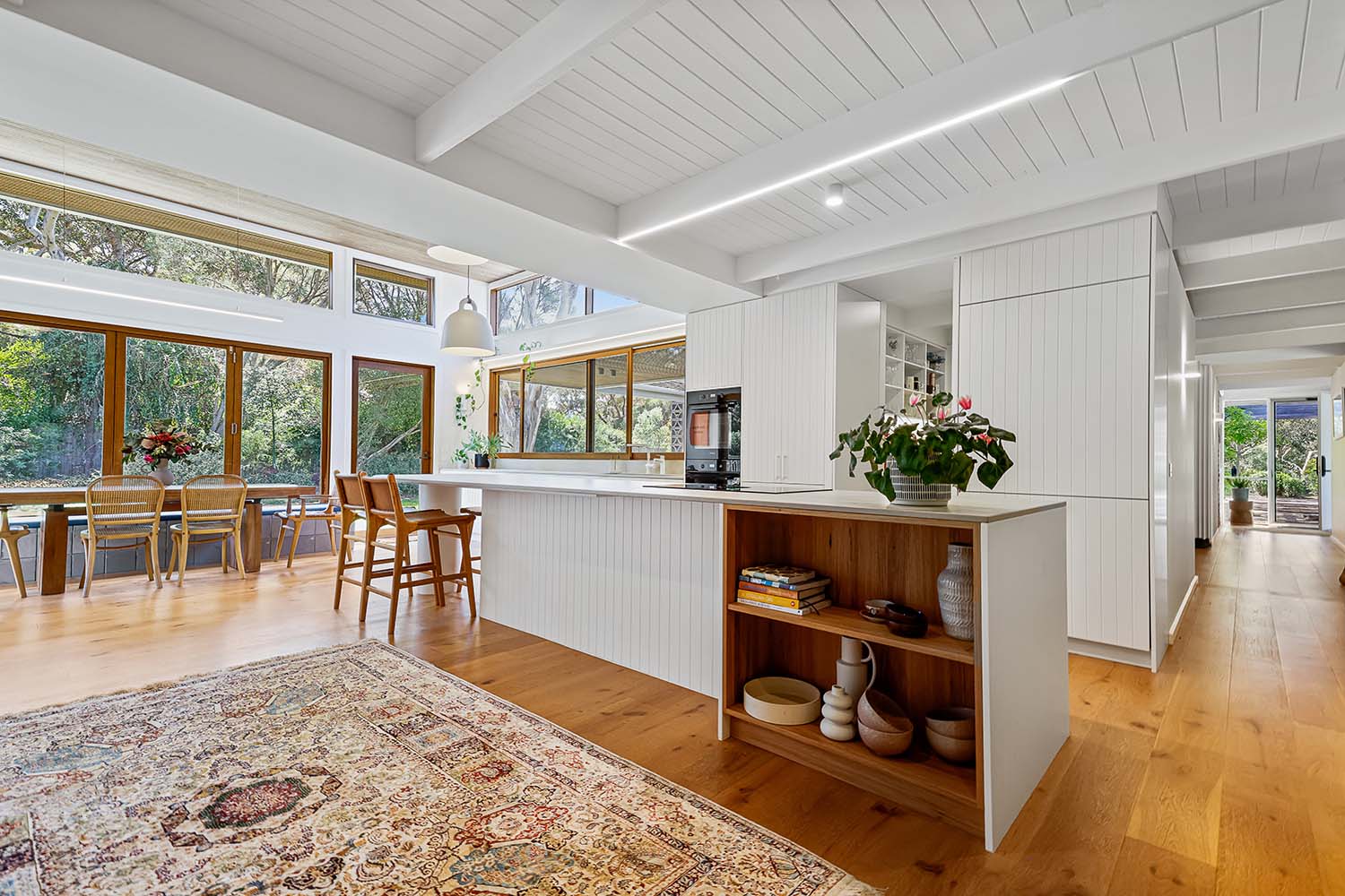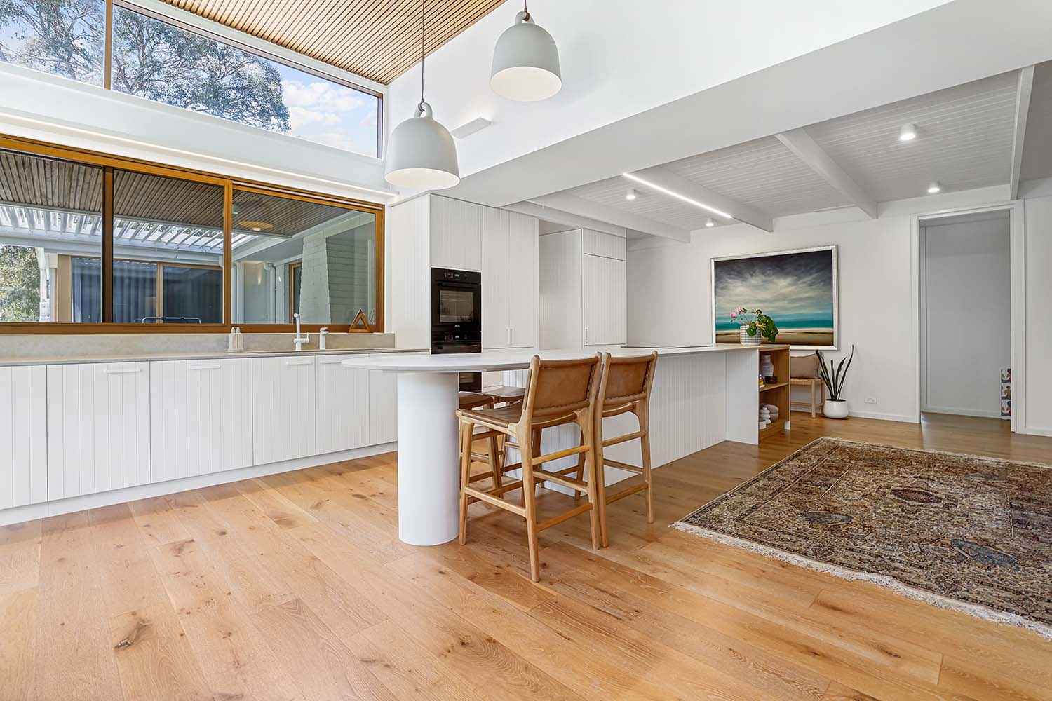 Light timber flooring, door and window frames bring warmth to the brilliant white of the walls and ceiling, and added accents of bohemian floor rugs and potted plants give the feel of an airy, laidback retreat. Rounded suspended pendant lights provide a point of interest in the overhead space afforded by the high ceilings, illuminated with high-set windows. The clean lines and neutral colour palette make the perfect foundation for a home that can take on multiple aesthetics.