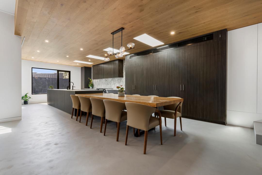 Luxury materials embrace the space. Bead blasted stainless steel benchtops adorn the island bar, while solid timber American Oak crafts the dining table. The result is an awe-striking blend of functionality and sophistication. .
