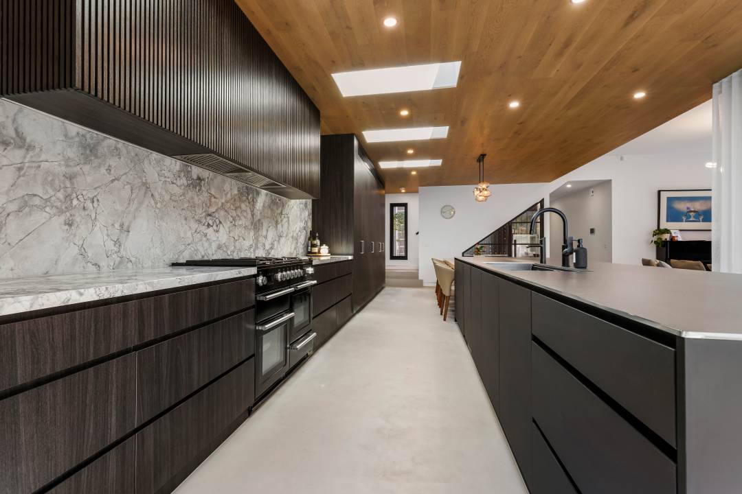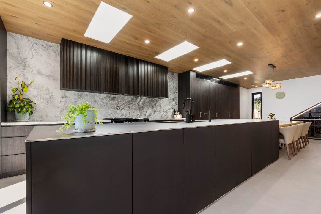 With unique materials, an integrated appliance station and connected dining, J & V Modern Cabinets’ newest project encapsulates the true essence of the heart of the home. The client required a balance of joinery over 11 metres without compromising on function. Through a fully integrated solution incorporating three refrigerators, the design achieves a stunningly seamless look. Concealed behind bi-fold doors, the integrated appliance workstation provides full, unobstructed access, ensuring functionality and ease of operation. This approach masterfully maintains a streamlined aesthetic while balancing accessibility with design integrity.