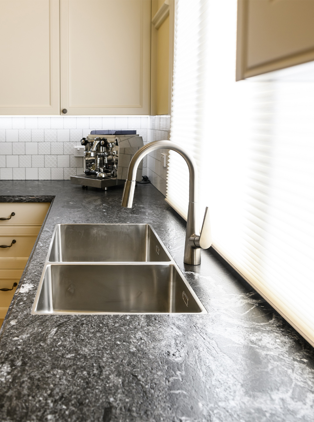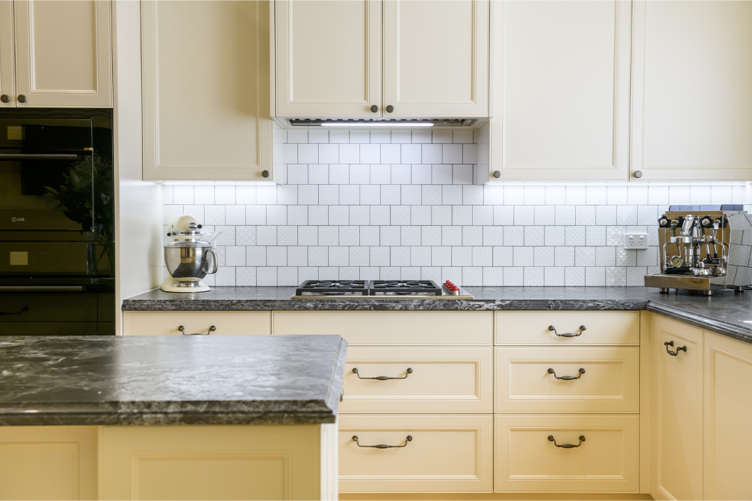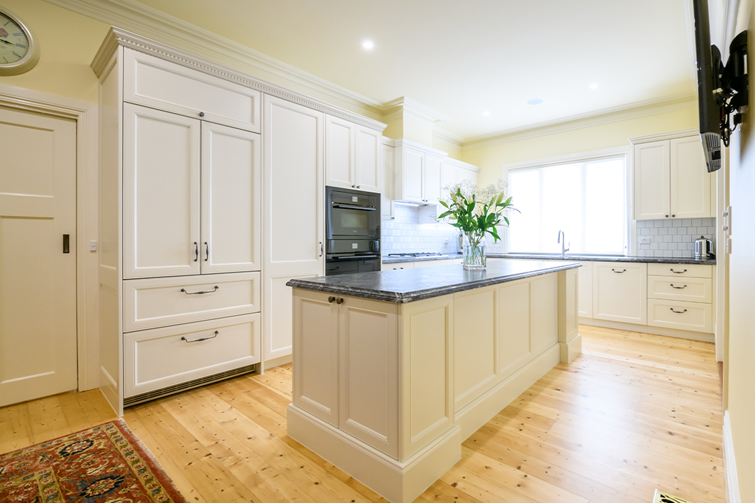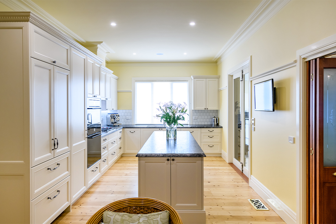 A range of highly detailed decorative elements add depth and charisma to the space and further enhance the home’s unique style. Custom capping mould and proud kickboards offer a regal flair and stand out as a stunning feature against the simplistic cabinetry profile – a look that harmonises with the home’s original cornicing. Elegant pewter handles and doorknobs further this traditional aesthetic, whilst introducing a touch of contrast into the kitchen.