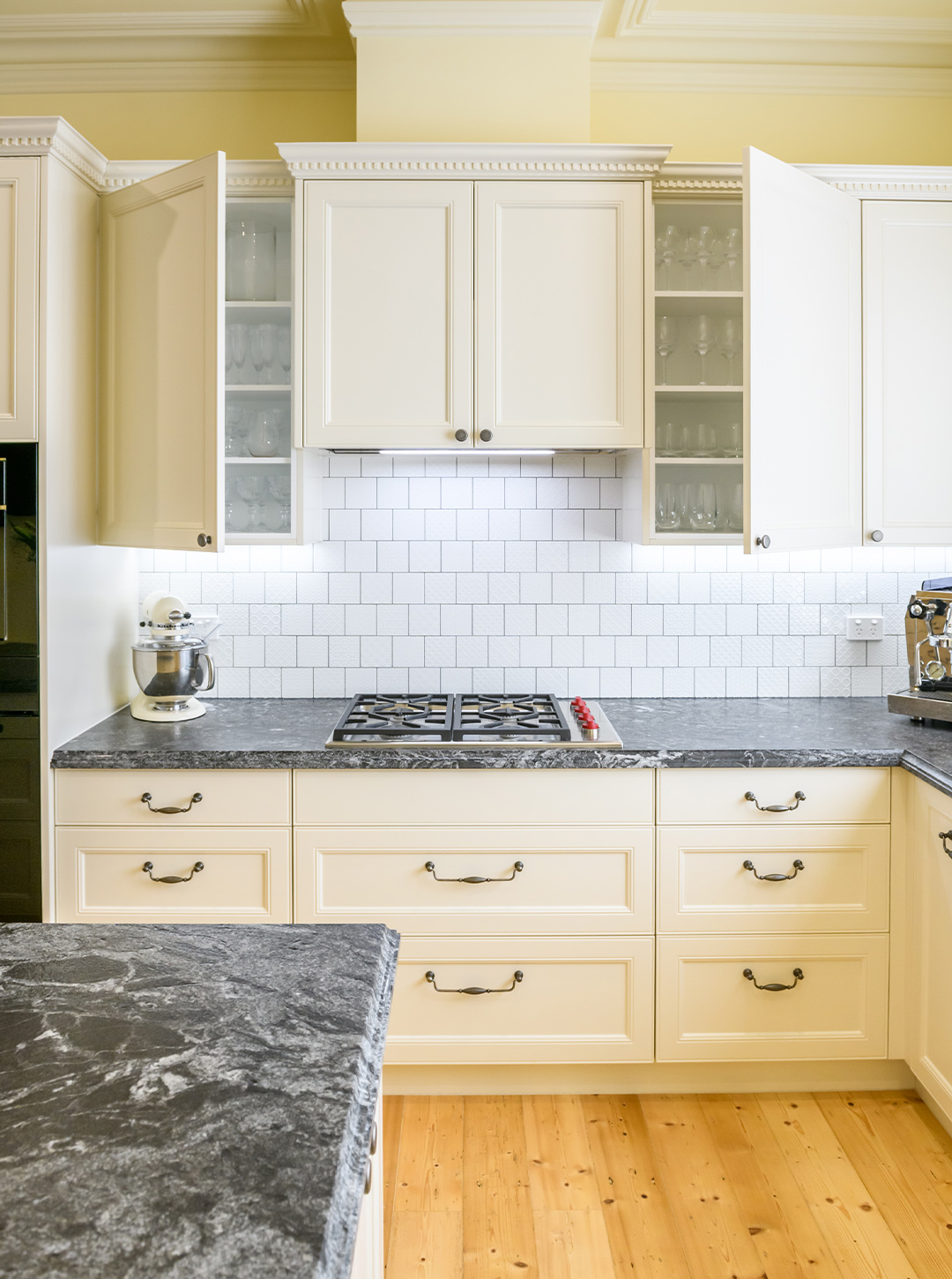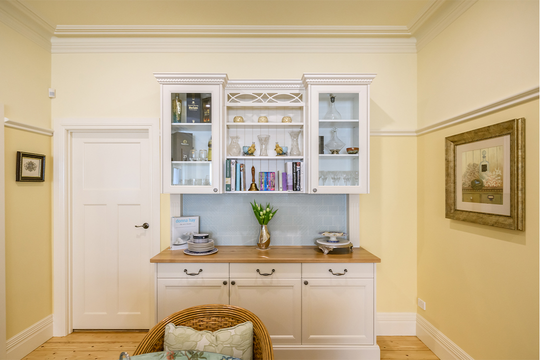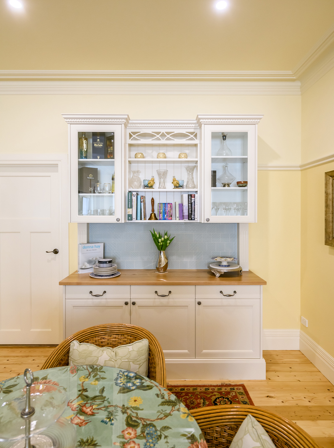A separate buffet and hutch unit were custom-designed and installed to offer additional storage for the kitchen as well as a place for the homeowners to display all of their more decorative pieces. A timber top was chosen for this piece to complement the house’s repolished Baltic pine floorboards.