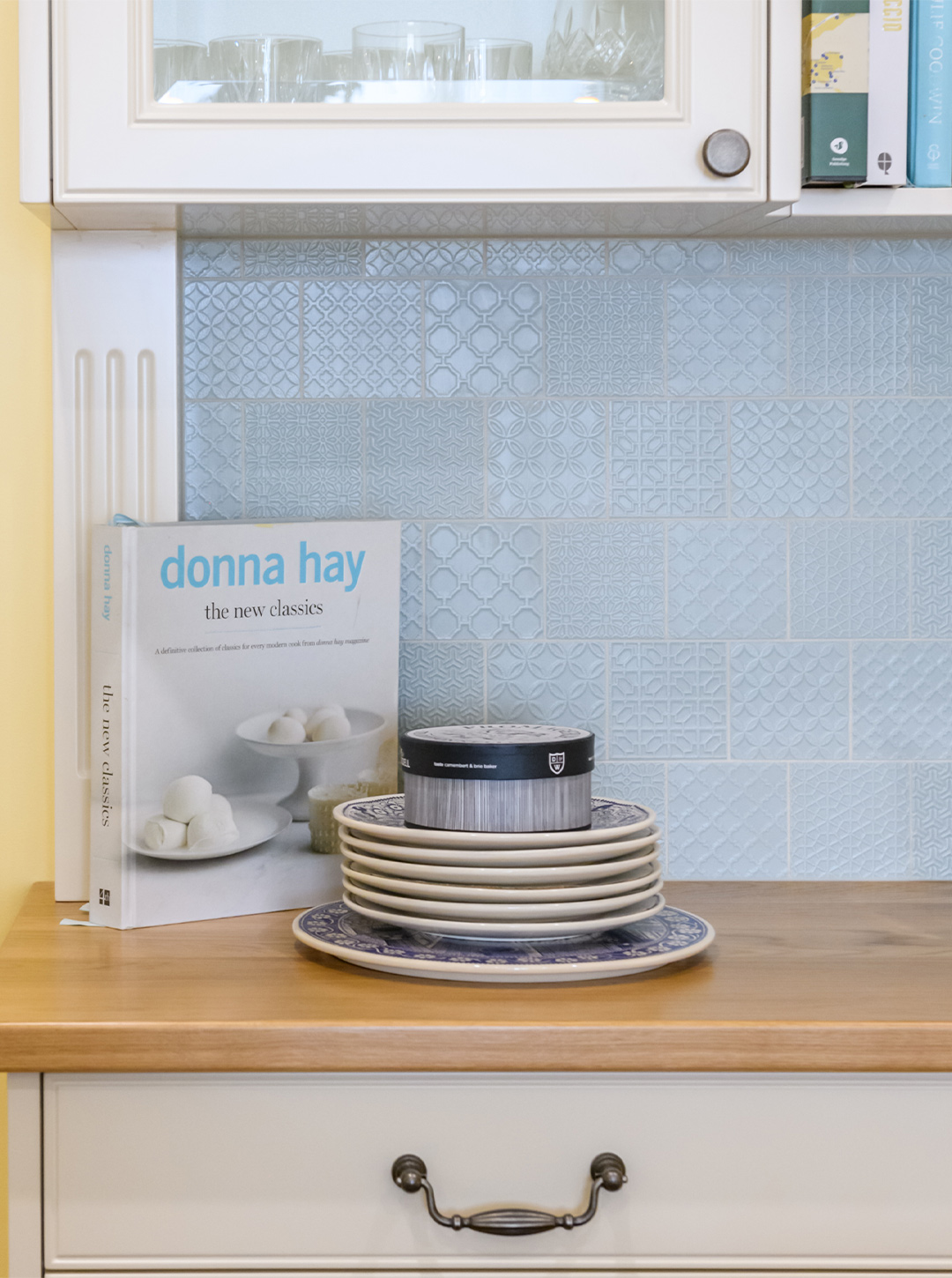 Rounding off this marvellous design, textured subway tiles by Southern Cross Ceramics form an appealing splashback and provide an additional level of detail into this elaborate zone. The same tiles in a soft blue take pride of place above the buffet, incorporating a splash of colour and completing this timeless kitchen.