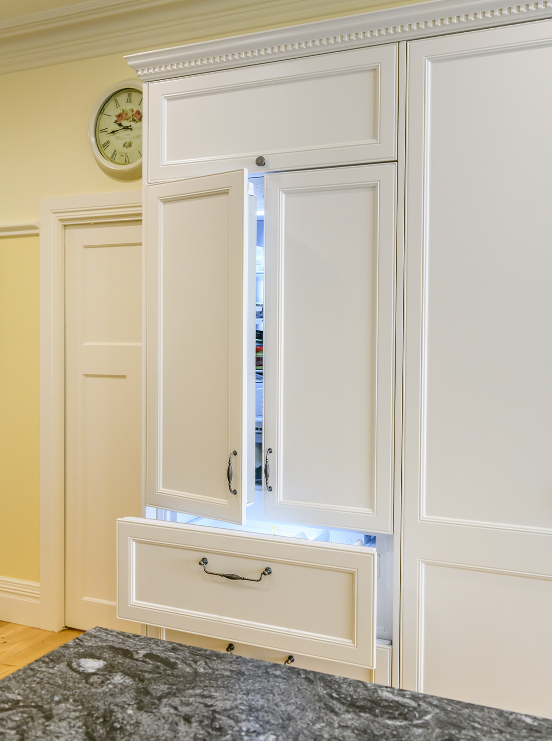 The homeowners sought a kitchen that would complement their federation-style home, while incorporating modern appliances. To meet this goal, Let’s Talk Kitchen’s & Interiors seamlessly integrated both the refrigerator and dishwasher into the classic shaker style cabinetry.