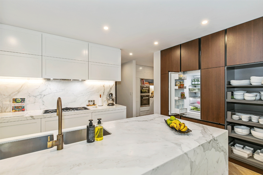 The cabinetry features a mixture of doors, including Tesrol 560 series finished in two-pack paint, as well as a ‘NATURAL’ Wenge timber veneer from George Fethers & Co. that is cohesive with the home’s European-oak flooring. The benchtops and splashbacks feature luxurious calacutta marble for a modern aesthetic. The cabinetry is fitted with Blum hardware – including LEGRABOX drawers, AVENTOS HF lift-up doors with SERVO-DRIVE and ORGA-LINE drawer dividers – to increase ease of access.