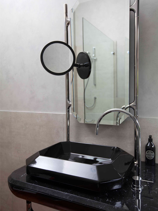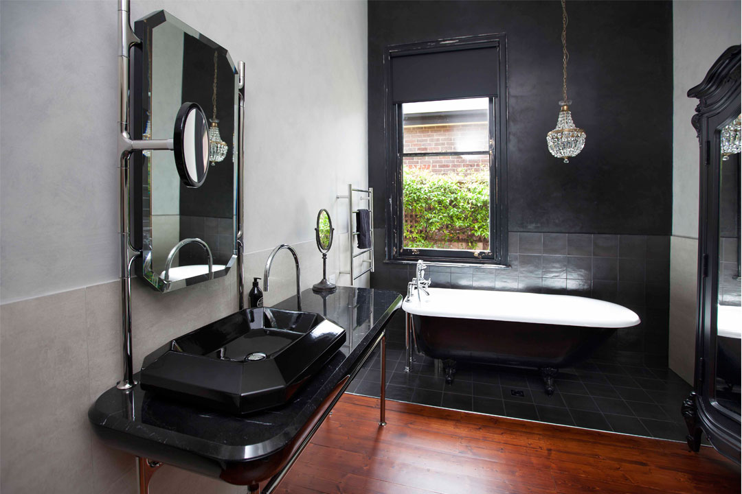 The existing timber floors have been paired with moody charcoal porcelain tiles and concrete textured walls to create a visually-intriguing experience. The striking vanity is part of Bisazza’s Bagno Collection, which was created by the renowned designer Jaime Hayon. The vanity’s unique elegance adds a sense of old-Hollywood glamour and European sophistication.