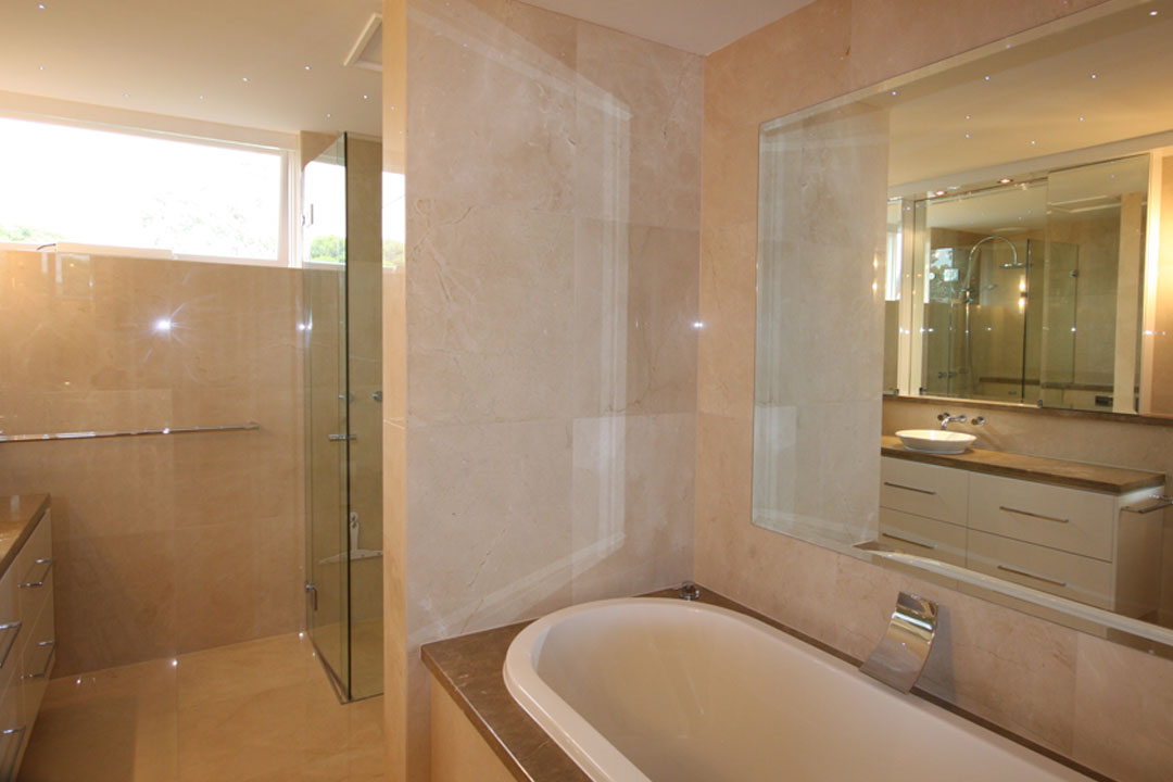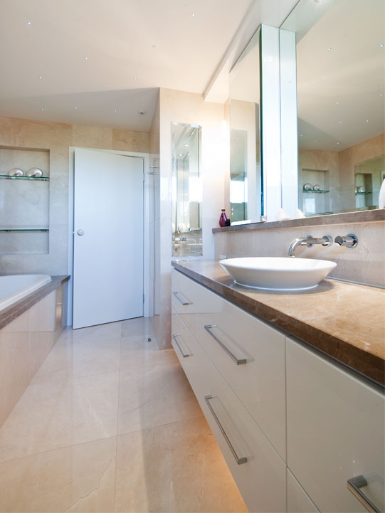 The stunning 600mm x 600mm Crema Marfil tiles give the room a stylish, clean look and supply the perfect backdrop for pampering. The large freestanding custom-made cabinets below the vanity are finished in Dulux Antique White USA paint and feature six large drawers as well as two internal drawers, providing abundant storage space.
