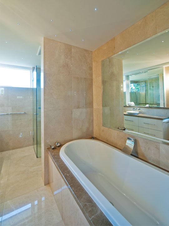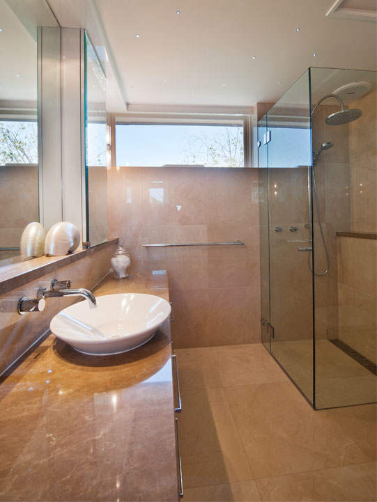 The temperature is maintained by thermostat-controlled Warmtech under-tile heating. Other modern design features in this bathroom include the frameless showerscreen in 10mm toughened glass and the tiled stainless steel grate shower base. The Kohler Conical Bell basin and Decina Lido Oval bath offer sleek shapes that enhance the sophisticated ambience in the space. Both the bath surround and the vanity top are Light Emperador marble.