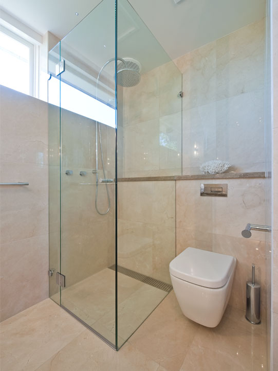 With marble walls and flooring and beautiful classical lines, this bathroom is a luxurious and comfortable space where Perini’s clients can unwind.