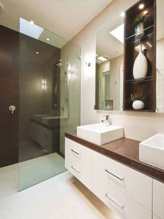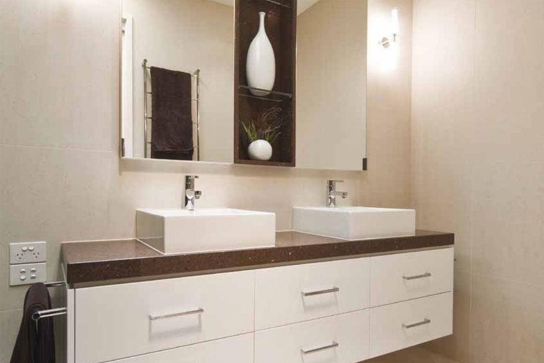 A rich, chocolate-coloured feature wall in the shower, custom-made Perini vanities and wall-mounted toilets provide both rooms with a high level of functionality and visual appeal. The vanities are painted in Dulux Vivid White Semi-Gloss and feature Taurus Brown Pearl tops.