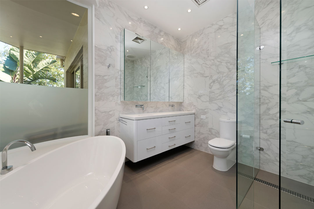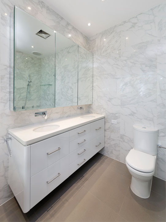 The large vanity houses matching his and hers undermount basins, which allows two people to comfotably use the space at the one time. The dark grey 600mm x 600mm porcelain floor tiles assist in making the space feel large and luxurious, and also complement the Perini porcelain Calacatta Lucido tiles that adorn the bathroom walls.