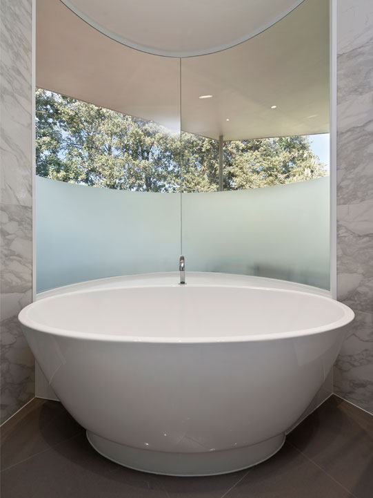 The centrepiece of the design is undoubtedly the lavish freestanding bath. The curvature of the Reece ‘Kado Cirque’ bath is beautifully accentuated by the curved full-height glass window located directly behind it, which also delivers gorgeous views and bathes the room in natural light.