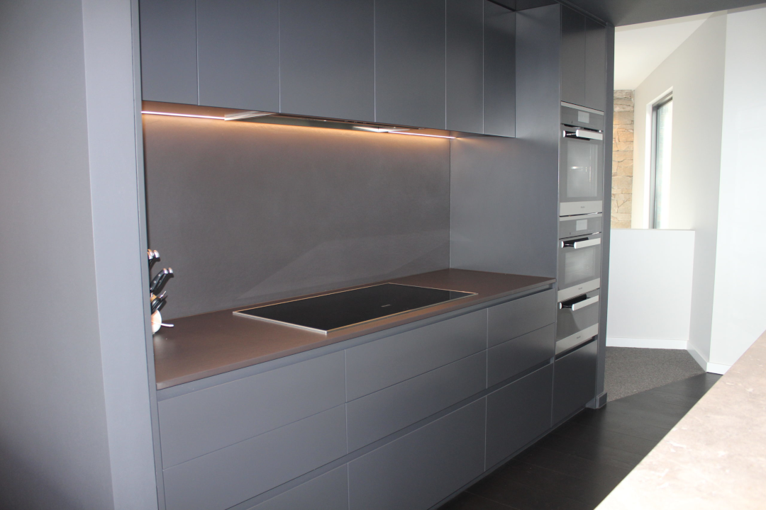 The appliances work seamlessly together with the custom cabinetry to create a modern built-in look through the timeless charcoal and glossy-white colour scheme. Modern profiles of the cabinetry and sleek finger-pull opening mechanisms across the home lend themselves to a truly streamlined look. The contemporary design is complemented by grey stone-look benchtops and splash-backs that flow seamlessly together, only elevating the elegance of this design.