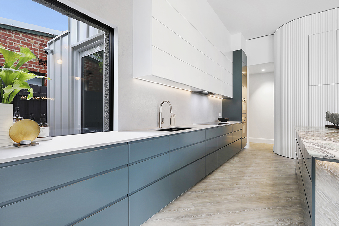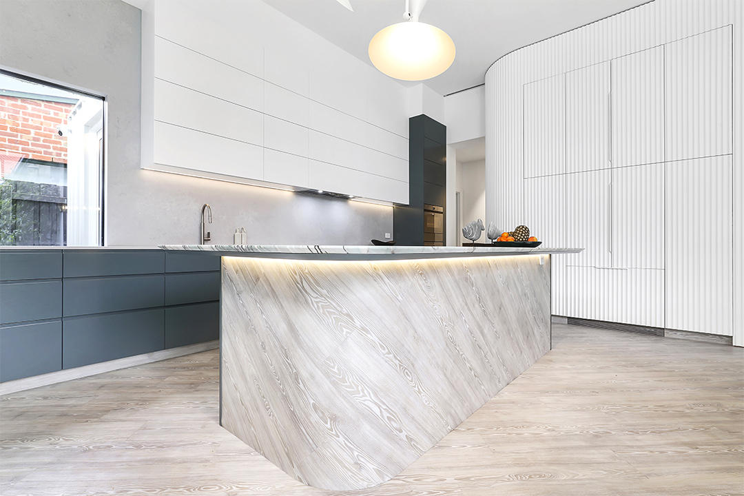 The exceptional team at Seaview Cabinets have masterfully produced this eclectic kitchen. Combining natural elements and painted finishes, the result is a clean minimalist look that excites the eye. This contemporary marvel is cleverly designed to create a sense of flow throughout the space. The soft edges of the kitchen island mimic the curved wall, and this is further enhanced by timber lining on the island that cohesively ties the natural pattern of the benchtop to the floorboards.