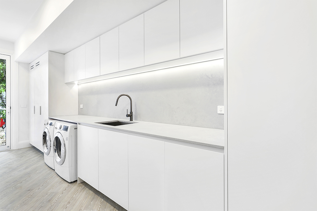Given the brief of ‘storage, storage, storage’, Seaview Cabinets has certainly not disappointed, making excellent use of the extraordinary ceilings by taking the cabinetry 3100mm high. This intelligent decision allows not only for optimal storage options but works to expand the space, highlighting the grandeur of the room.