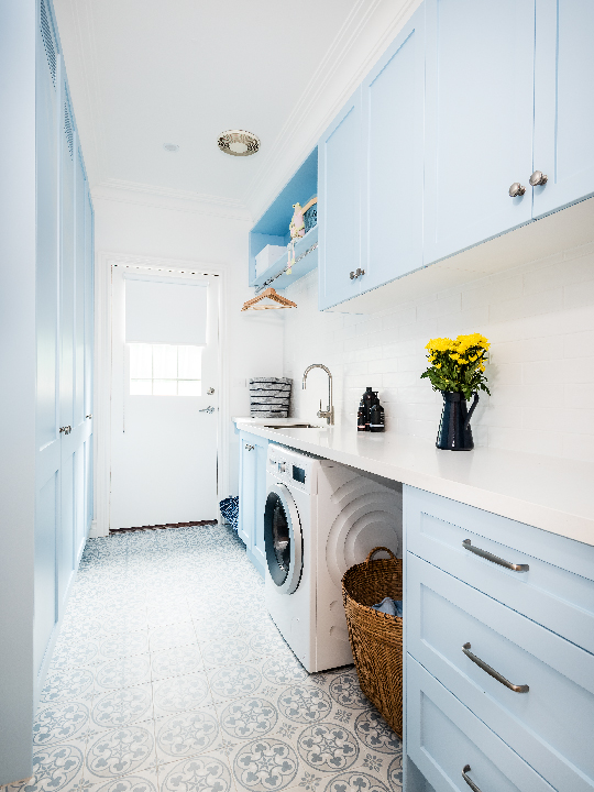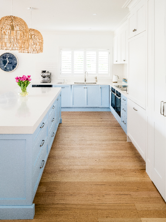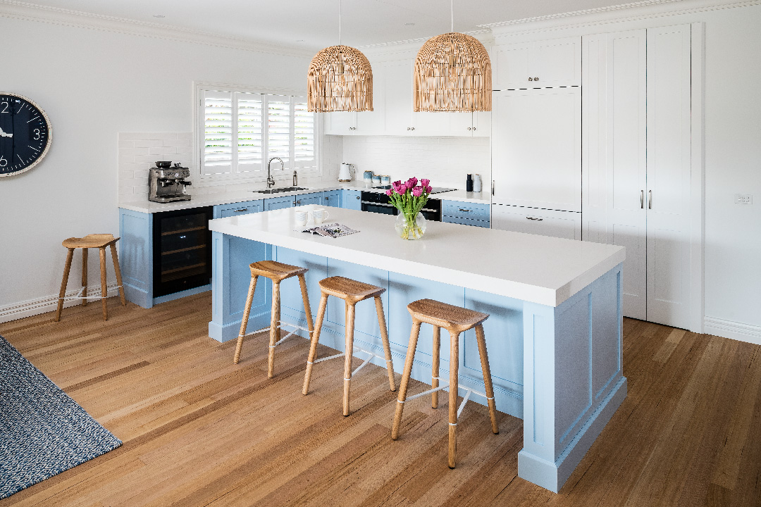 Pale blue provides a welcome break from the all-white colour scheme often seen in Hamptons style. Smith & Smith Kitchens has paired this beautiful blue with pretty whites, making the shaker-style cabinetry and Caesarstone ‘Organic White’ benchtops a heavenly combination. This engineered stone bridges the kitchen’s classical and contemporary elements and looks divine. Castella Century handles and knobs in satin nickel are a lovely finishing touch.