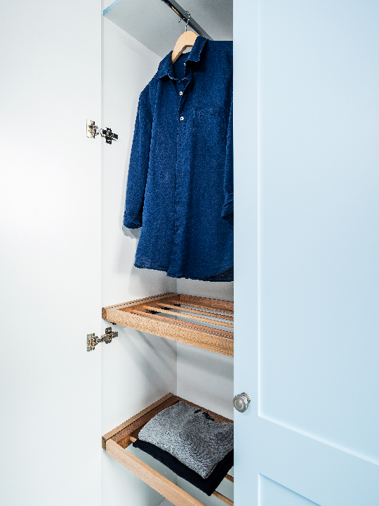 Bi-fold cabinet doors that match the rest of the kitchen also form a secret entry to the walk-in butler’s pantry. Here, the homeowners have the option of wide drawers, overhead cabinets and open shelves for accessible storage and functionality, plus an extra bench for appliances, illuminated by LED lights.