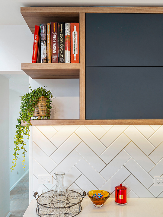 Tulip Kitchens & Designs perfectly tied in a calming, coastal aesthetic into this project with a pairing of stylish ‘Grigio Bromo’ and vibrant white cabinetry framed in warm oak tones. Under-cabinetry lighting adds a splash of modern sophistication and draws the eye to the stunning statement created by the timber-framed wall cabinetry. Herringbone white subway tiles serve as the splashback to both the kitchen and European laundry, the pattern bringing the perfect amount of texture to enhance but not compete with the marble-patterned island counter.