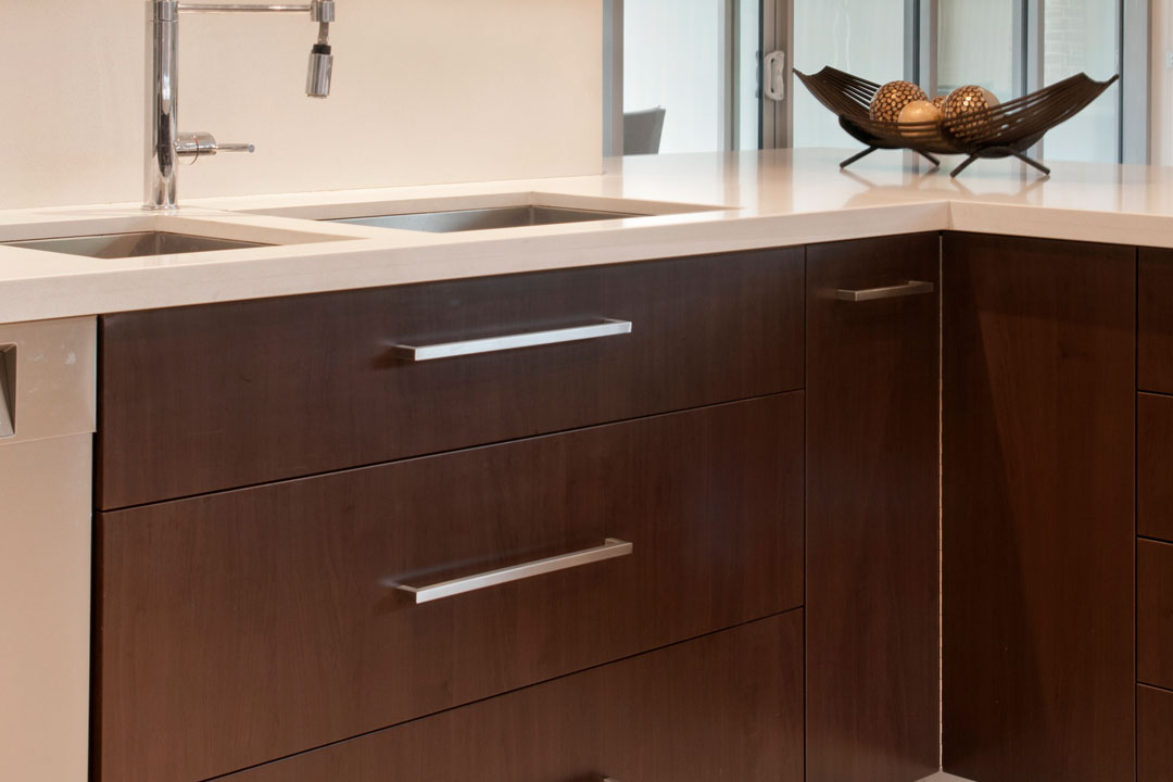 Adjoining benches of two different heights provide a great space for serving food when the clients have guests over, and the L-shape that the benches form is perfect for encouraging conversation, as guests can easily interact whether sitting or standing at either bench.