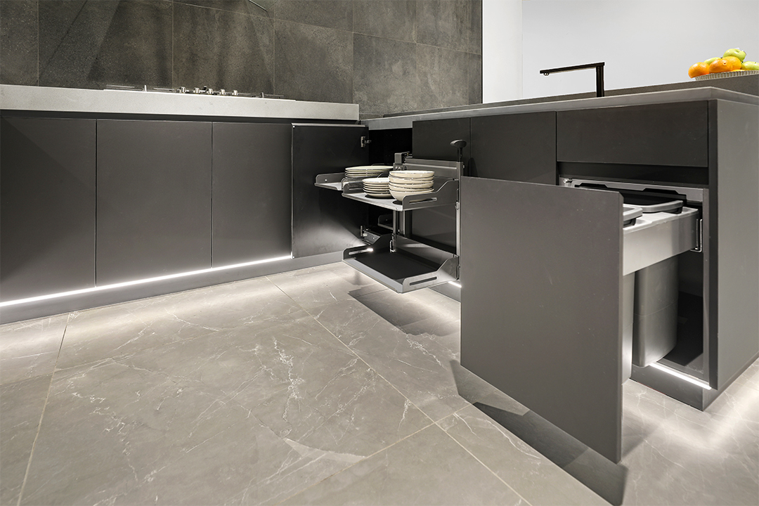 The showroom exhibits three brand-new kitchen displays, showcasing products from Nover, Nikpol and Polytec, all with the latest technology, industry innovations and intermixed hardware from suppliers such as Blum and Hafele. Boasting current trends and functional features, these kitchens are available for customers to explore at their leisure.